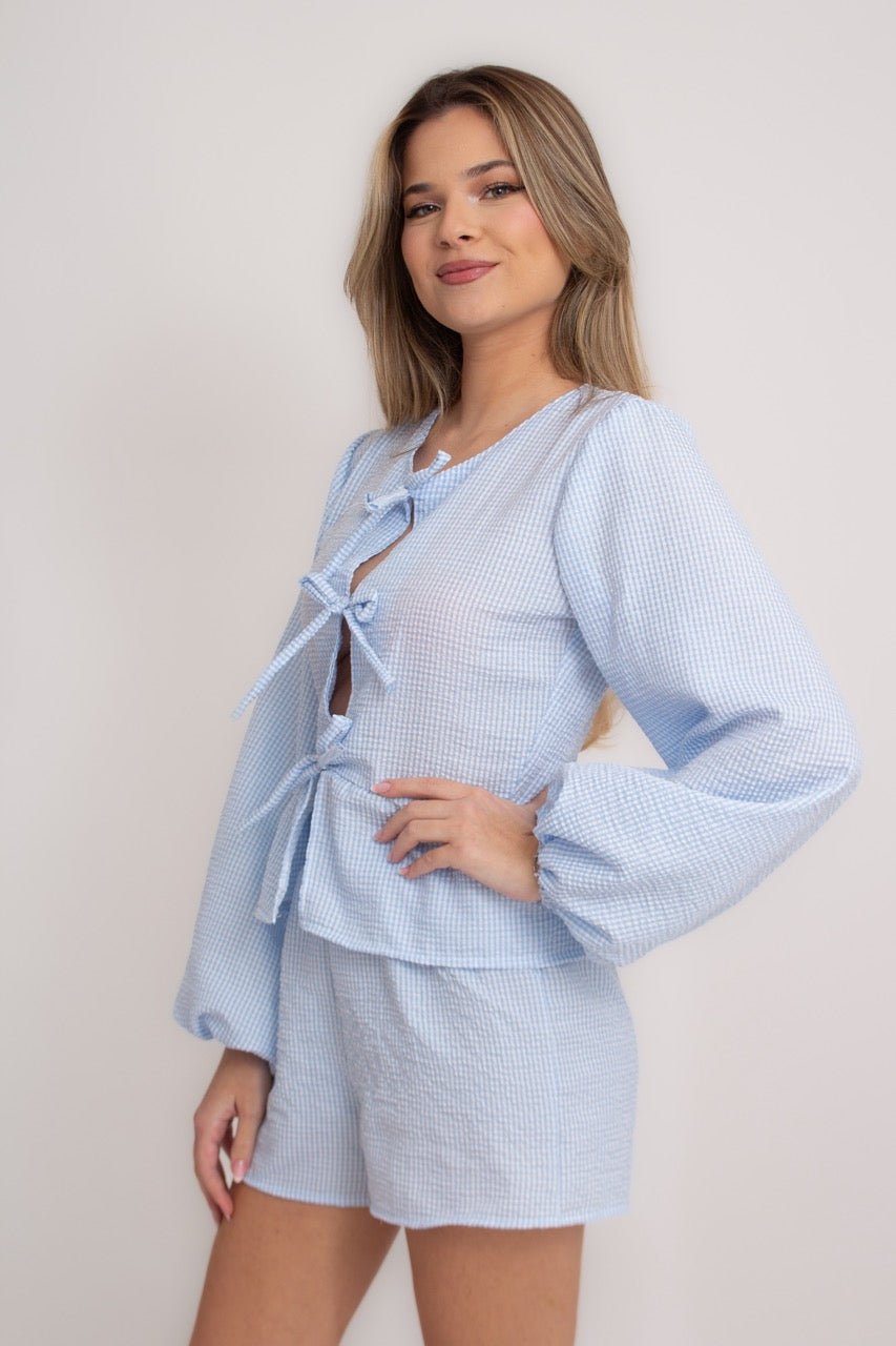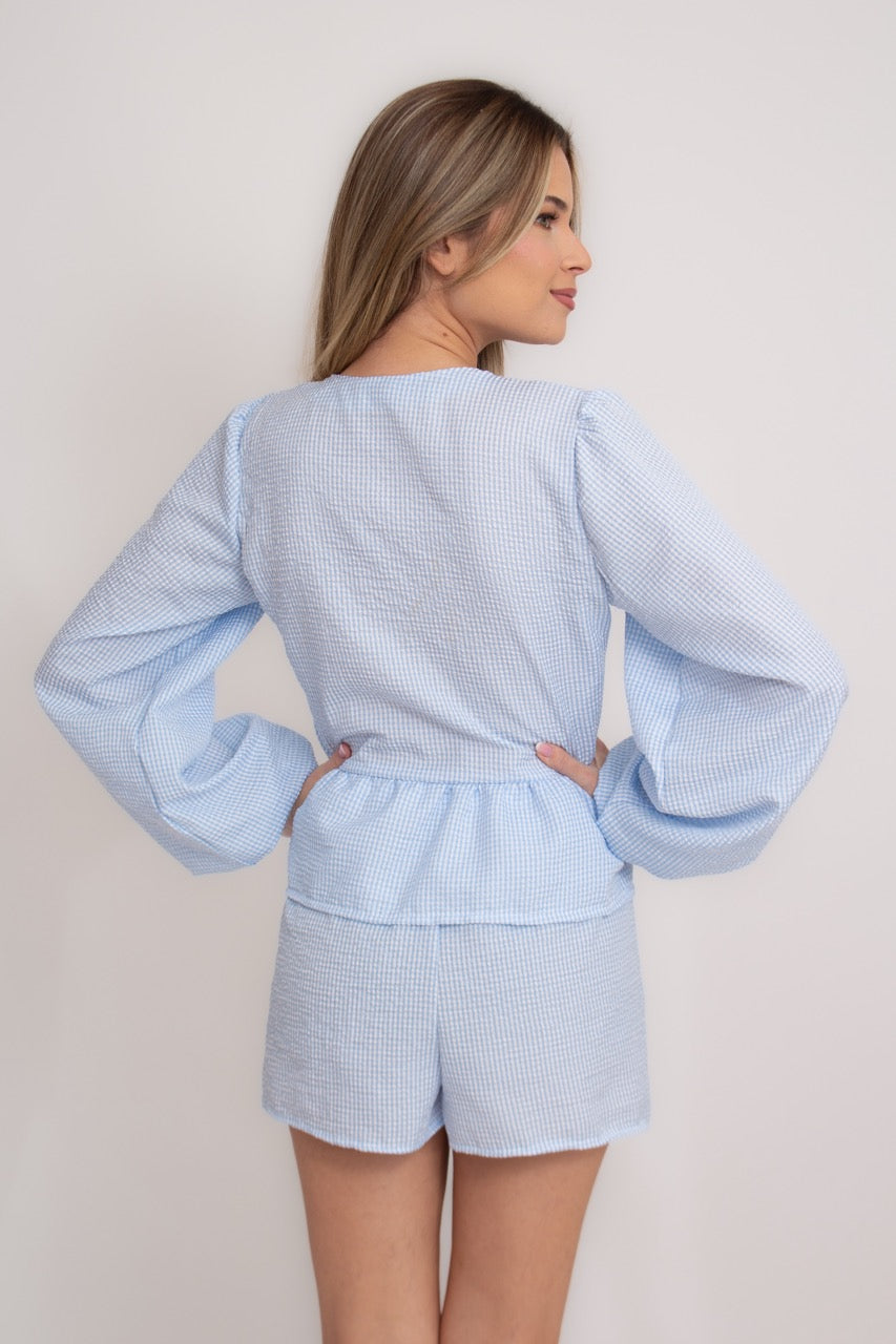 Bata de Anarruga azul com manga longa bufante e lacinhos na frente. Babado na cintura.