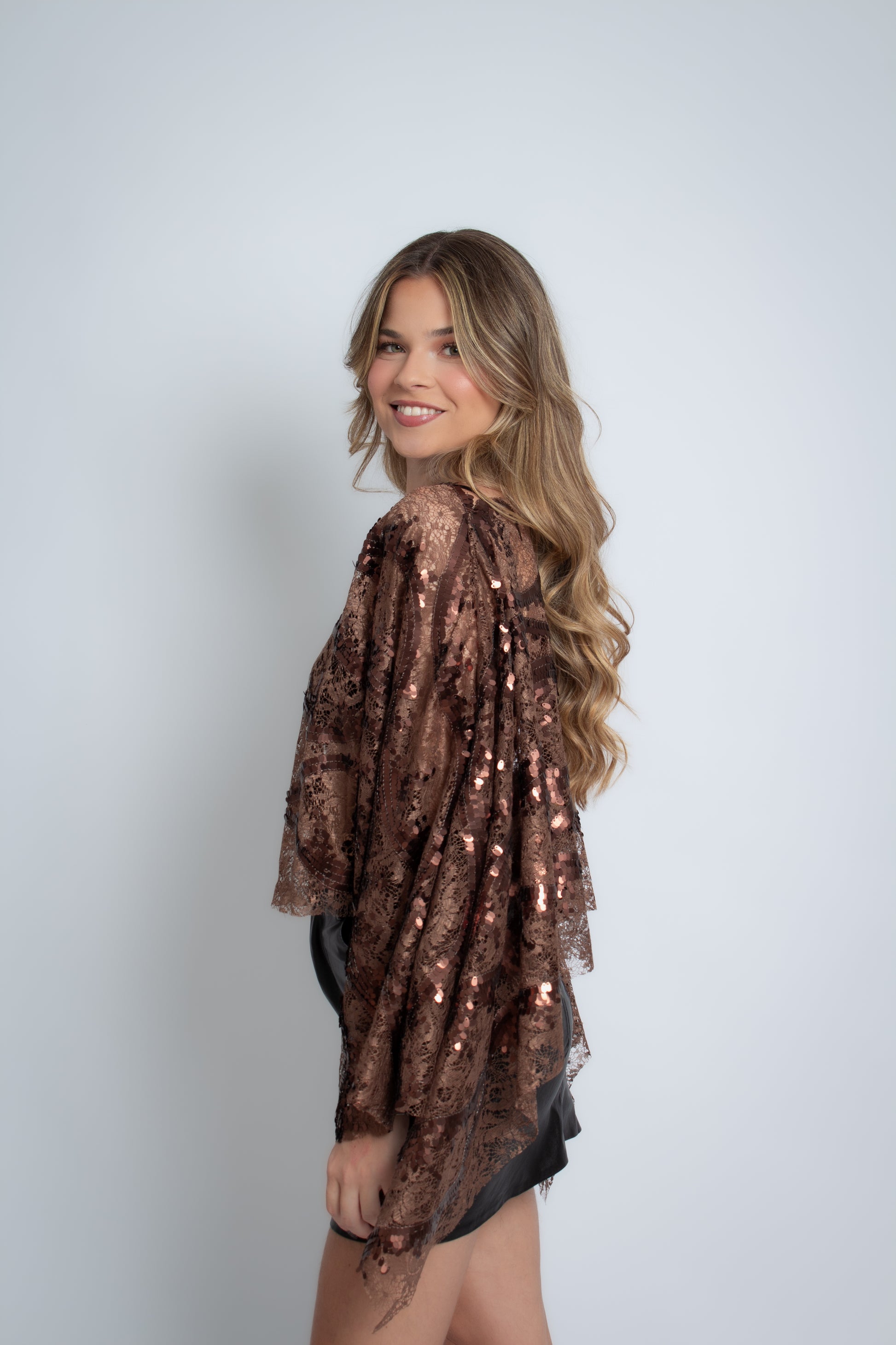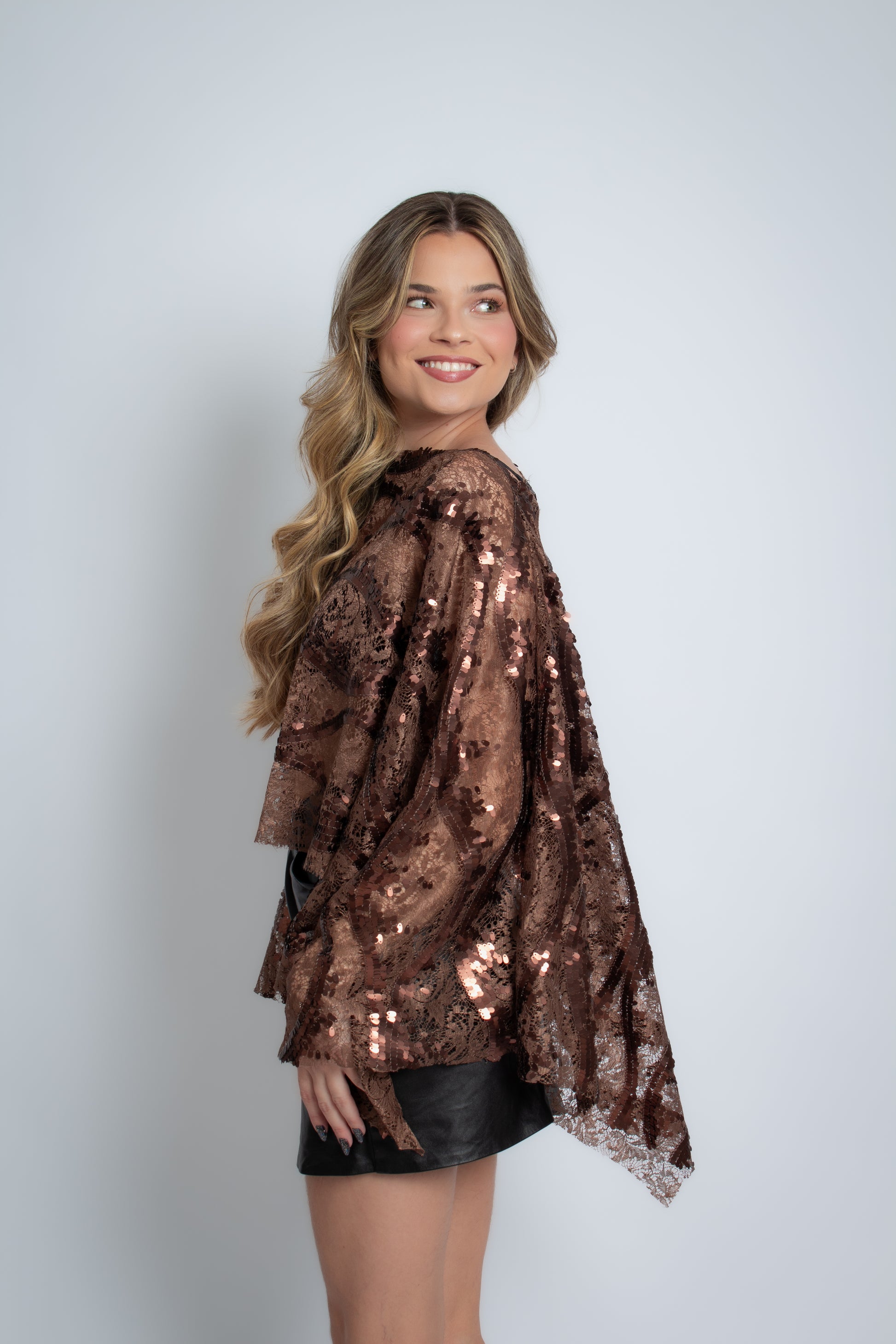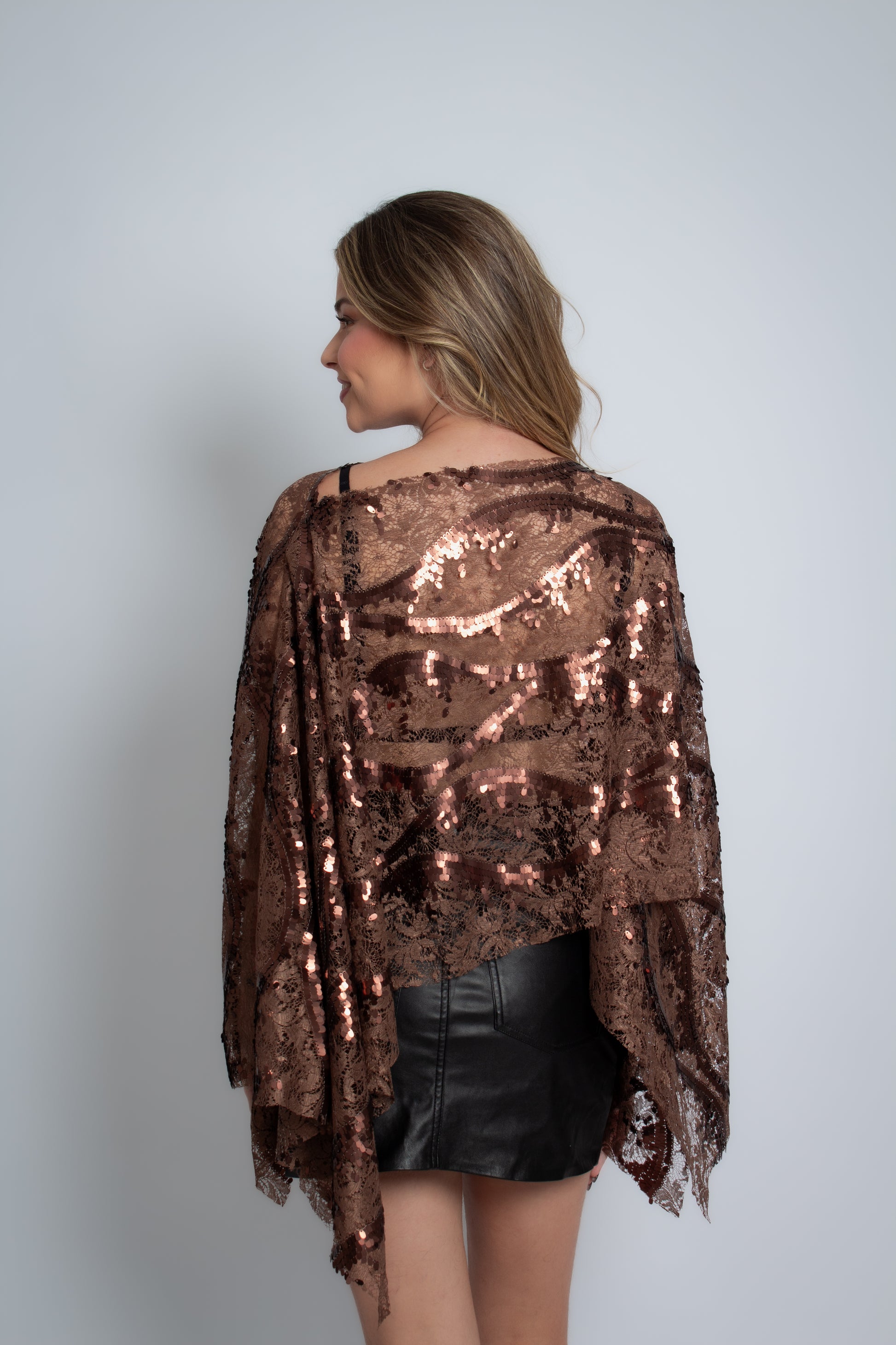 Blusa marrom em renda com paetês, mangas amplas e caimento fluido. Sofisticada e marcante, perfeita para jantares, eventos e looks elegantes.