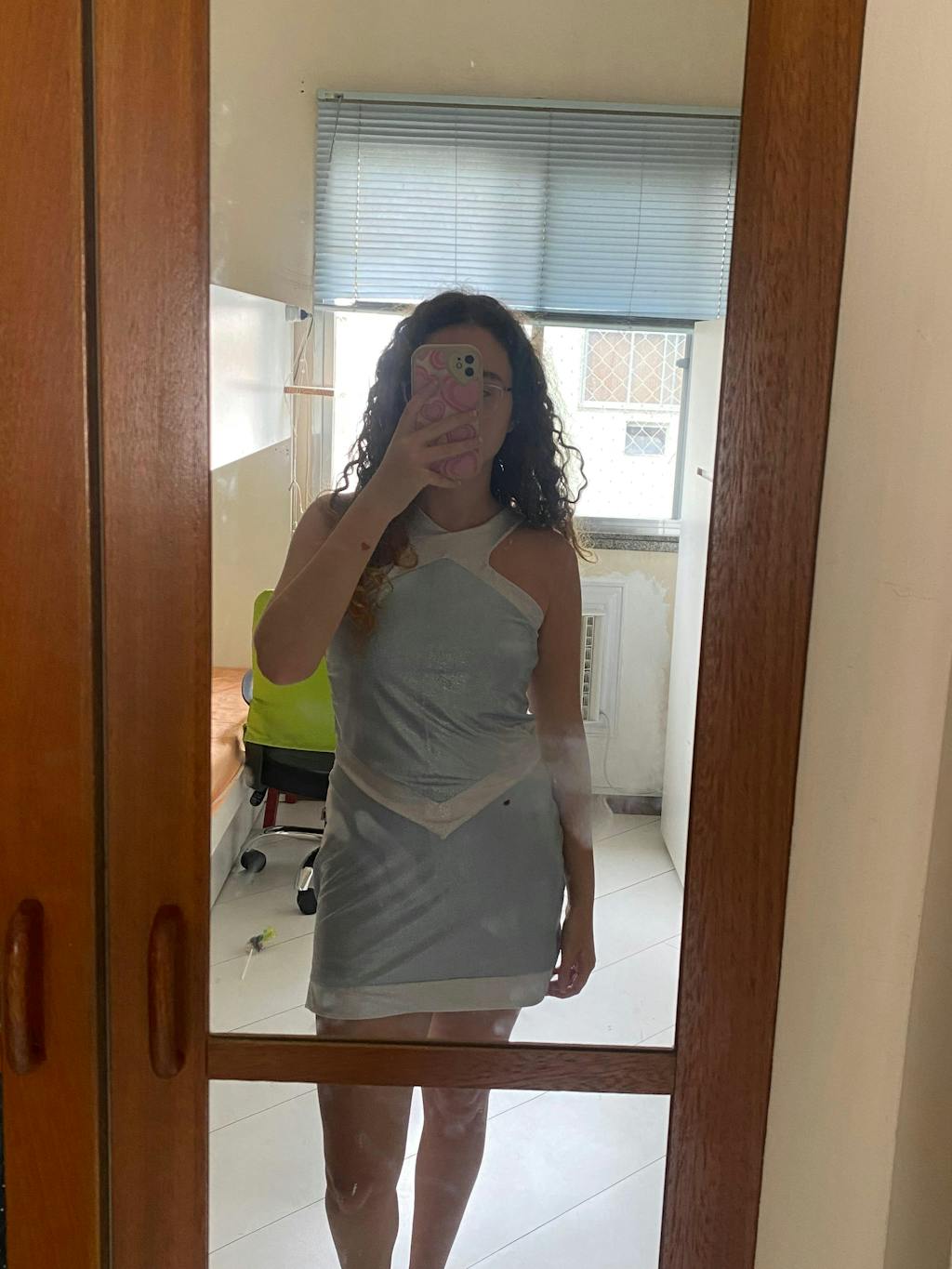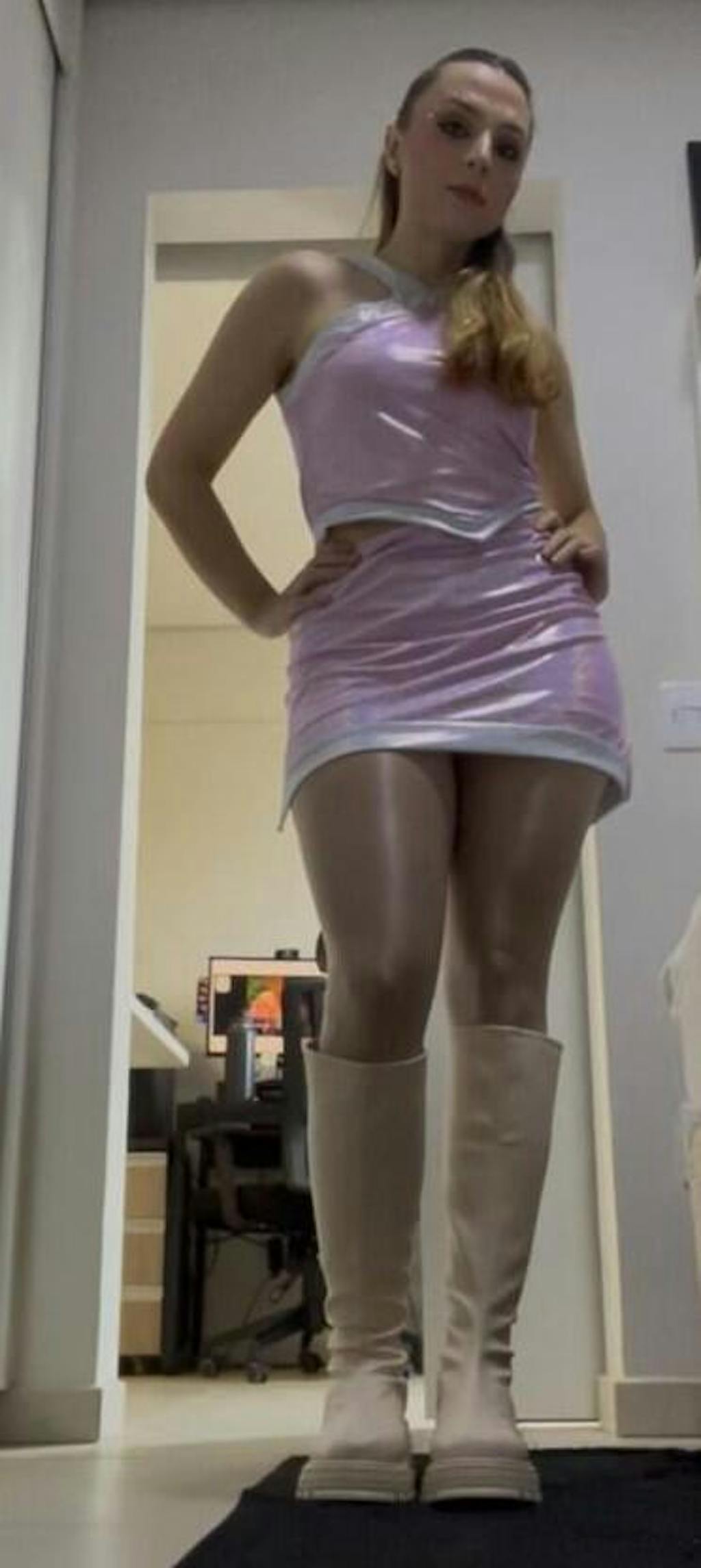 Confeccionada em tecido acetinado com brilho holográfico, ela reflete a luz de forma suave e moderna. O decote fechado com recortes geométricos traz personalidade ao visual, enquanto a modelagem ajustada valoriza o corpo sem apertar. O caimento é leve e confortável, ideal para usar por horas sem incômodo. Os detalhes em tom contrastante reforçam o design exclusivo da peça.