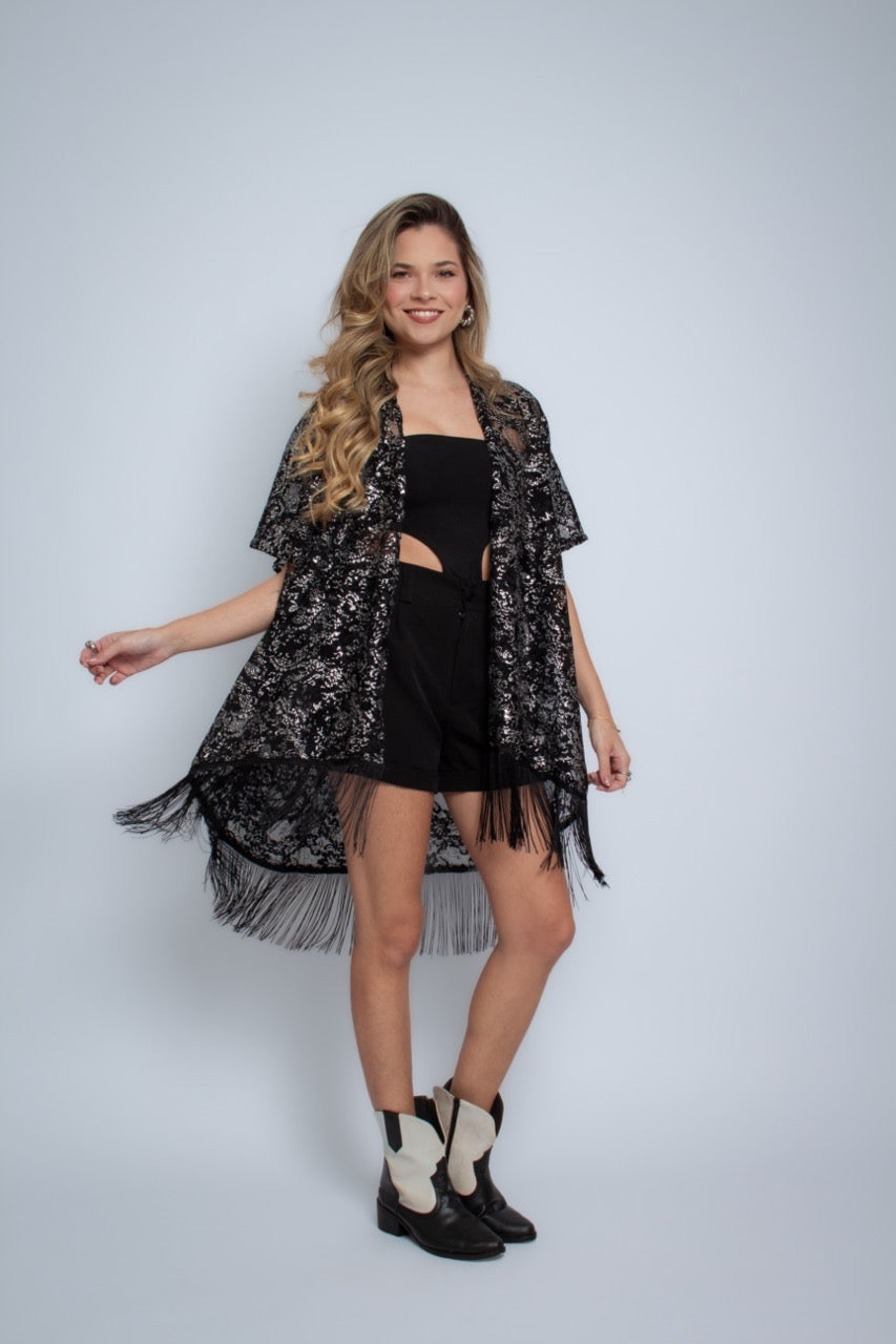 O kimono perfeito para elevar qualquer look com um toque boho sofisticado e cheio de atitude. Com brilho metalizado e franjas na barra, essa peça é uma explosão de estilo e versatilidade, ideal para produções noturnas, festivais ou sobreposições fashionistas no dia a dia. Um item-chave que transforma o básico em extraordinário com apenas um movimento.