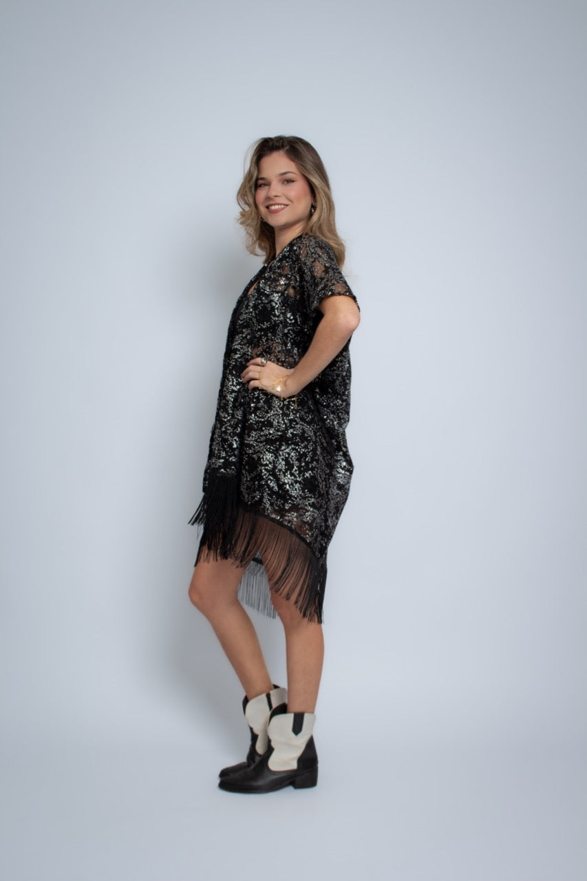 Vestir esse kimono é se sentir instantaneamente mais confiante e ousada. O brilho sutil reflete a luz com elegância, enquanto as franjas dançam com seus movimentos. É a peça que transforma um look simples em uma produção cheia de presença e estilo — sem esforço.