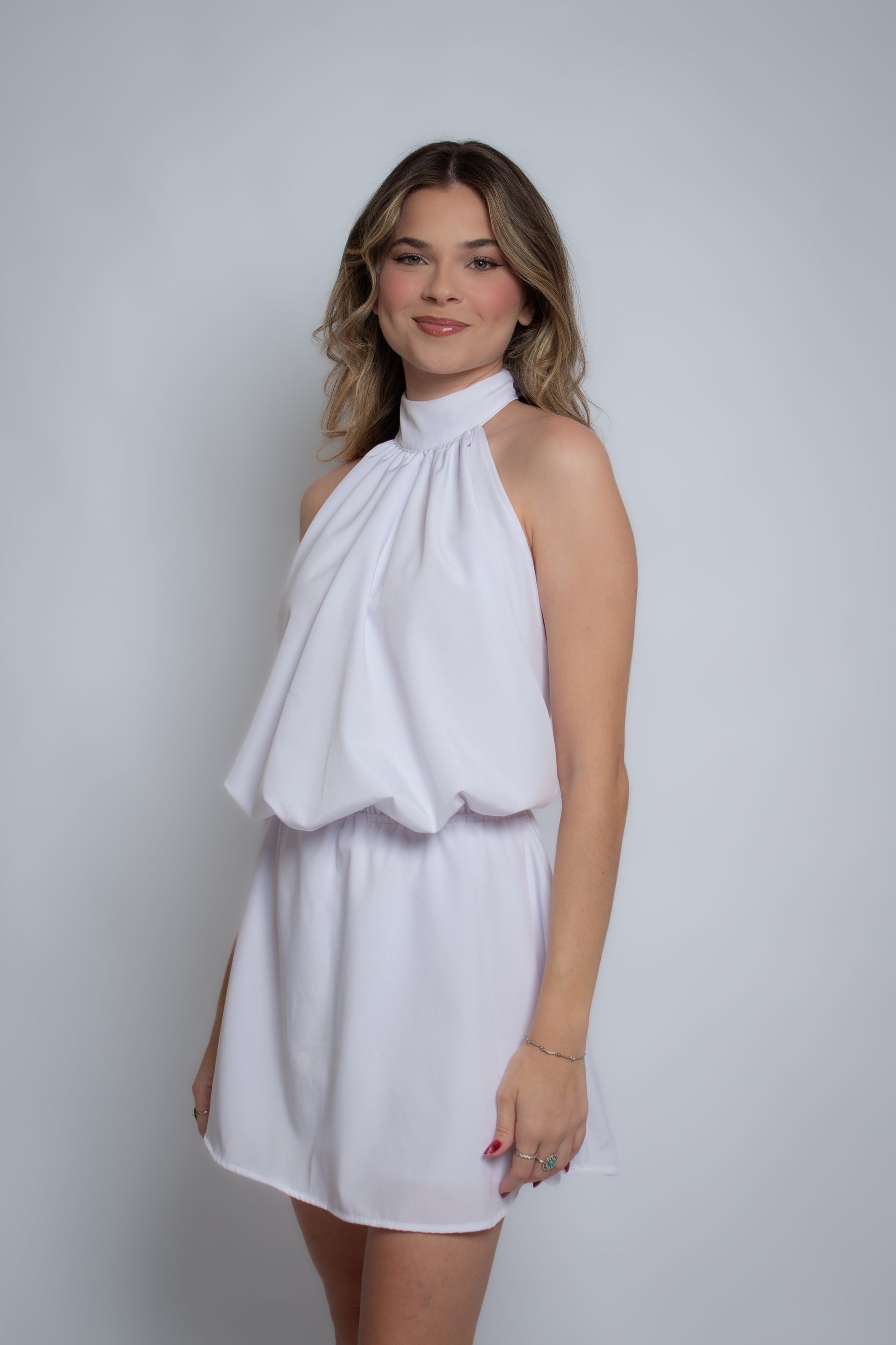 Ele é confeccionado em tecido fluido, com um toque suave na pele. O decote halter traz elegância, deixando ombros à mostra de forma delicada, enquanto o caimento soltinho deixa o corpo respirar — nada de aperto, nada de prender o movimento. A cintura é levemente ajustada, criando uma silhueta natural e confortável. O comprimento curto dá frescor e leveza, perfeito para quem ama peças que acompanham o ritmo do corpo. É uma peça versátil e atemporal, pensada para durar no seu guarda-roupa.